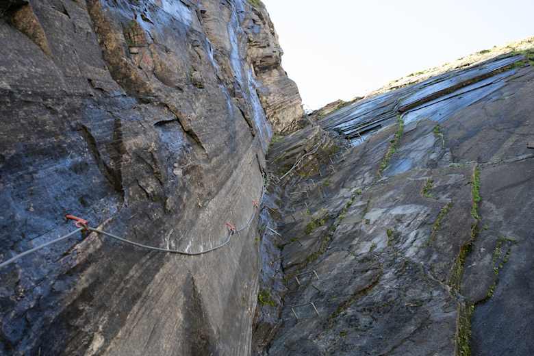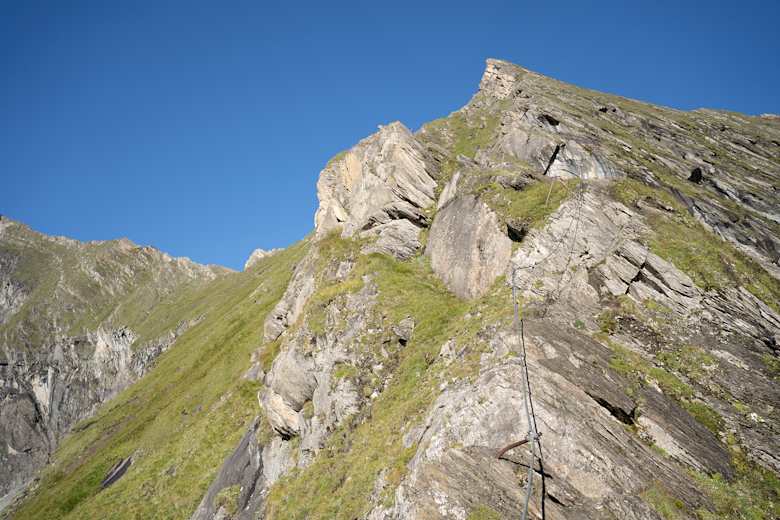 Eisenstangen und ein daran befestigtes Stahlseil leiten von der Scharte rechts hoch. Foto: Matthias Knaus