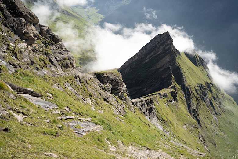 Ausrüstung: Zusätzlich zur persönlichen Bergausrüstung, Spikes, Gurt und ein Mindestmaß an Sicherungsmitteln (z.B. Klettersteig-Set oder kurzes Seil). Auf gutes Schuhwerk sollte geachtet werden, denn der Untergrund ist sehr vielseitig (Fels, Geröll, Schrofen- und Wiesengelände).