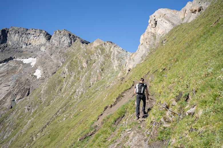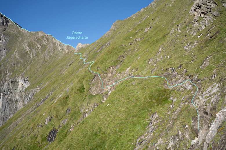Zwischen Unterer und Oberer Jägerscharte (2.752 m) ist das Gelände durchgehend steil. Erst steigt man am Grat entlang, danach quert man steiles Wiesengelände. Die beinahe durchgehende Wegversicherung mit Stahlseilen ist in diesem Abschnitt besonders wertvoll, vor allem bei Nässe herrscht hier Ausgleit- und Absturzgefahr.