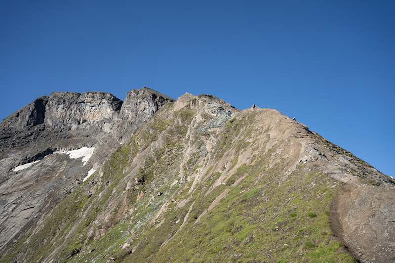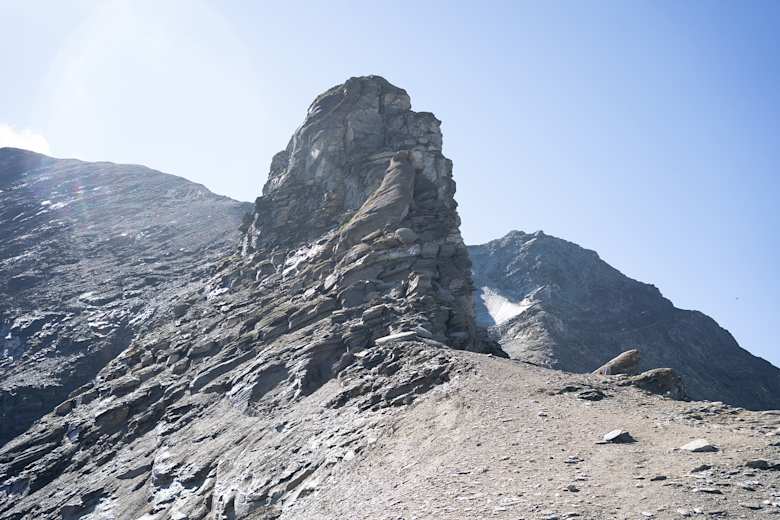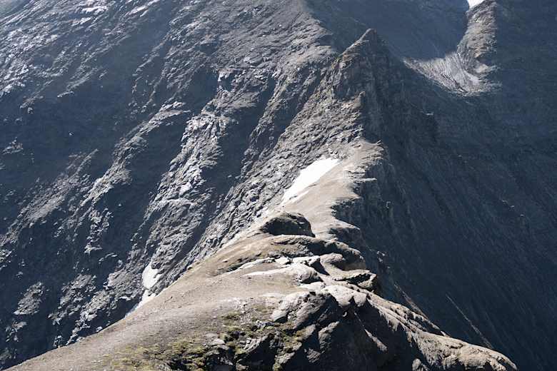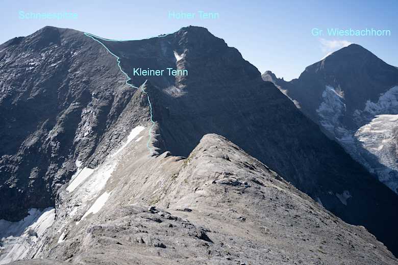 Der Kleine Tenn (3.158 m) schreckt erst einmal ab, denn sehr steil und unmittelbar erhebt er sich an der Gratlinie. Der Weg führt im einfachsten Bereich des Steilaufschwungs in schöner Linienführung hoch, künstliche Tritt- und Haltepunkte erleichtern den Aufstieg immens. Vom Gipfel des Kleinen Tenn dem nun wieder einfacheren und weniger steilen Kamm entlang aufsteigen, bis kurz unterhalb der Schneespitze (3.317 m). Diese kann rechts (westseitig) auf Wegspuren umgangen werden – man spart sich dadurch ein paar Höhenmeter.