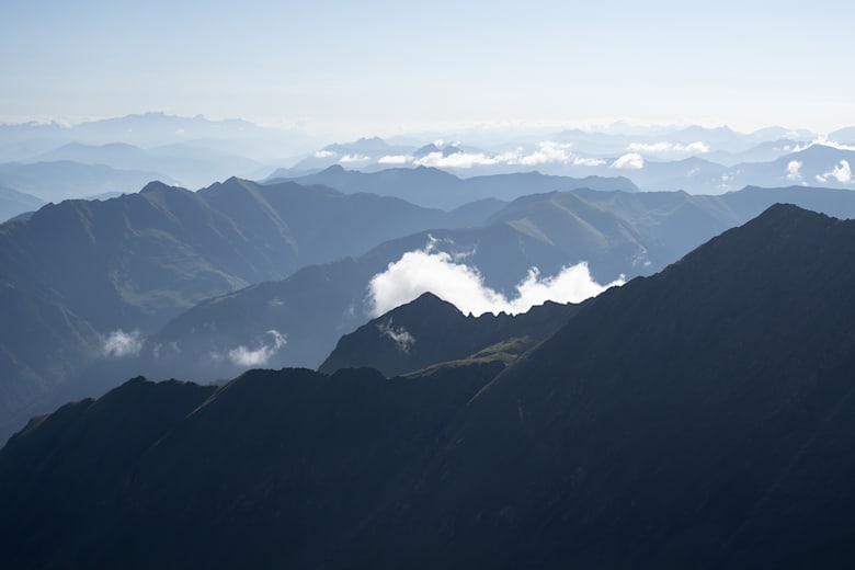 Zwischen Kempsenkopf und Bauernbrachkopf. Im Hintergrund, Schneespitze (3.317m, links) und Hoher Tenn (3.368m, rechts). Foto: Matthias Knaus