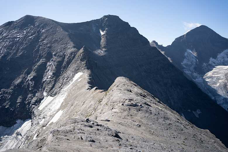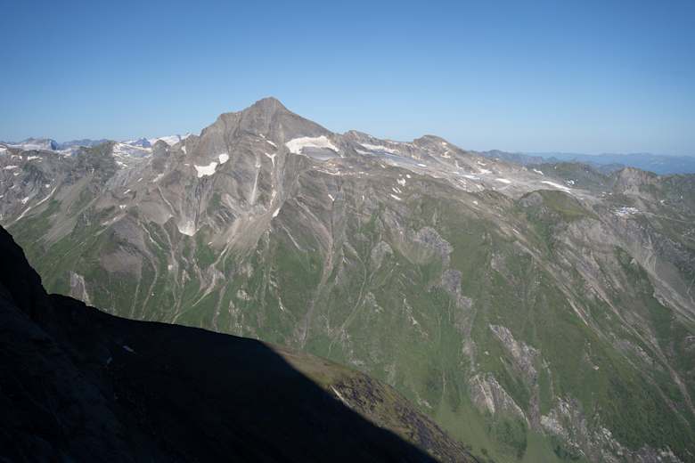 Im Schattenbereich befindet sich die Untere Jägerscharte. Dahinter Kempsenkopf (3.090m), Bauernbrachkopf (3.125m) und ganz links, der Kleine Tenn (3.158m). Foto: Matthias Knaus