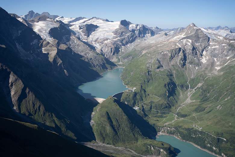 Die Stauseen Mooserboden (oben) und Wasserfallboden (unten). Rechts, der Hocheiser (3.206m), links anschließend, Hohe Riffl (3.338m) mit Karlingerkees und der Kamm bis zum Großglockner (3.798m). Foto: Matthias Knaus