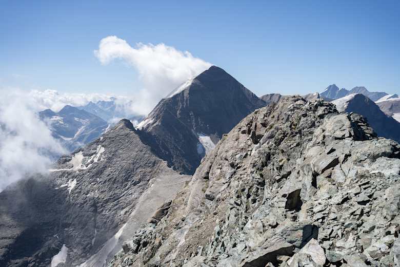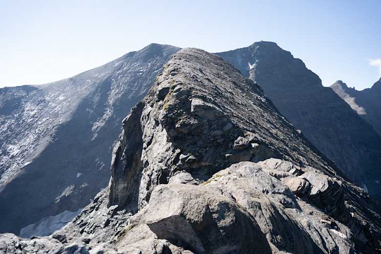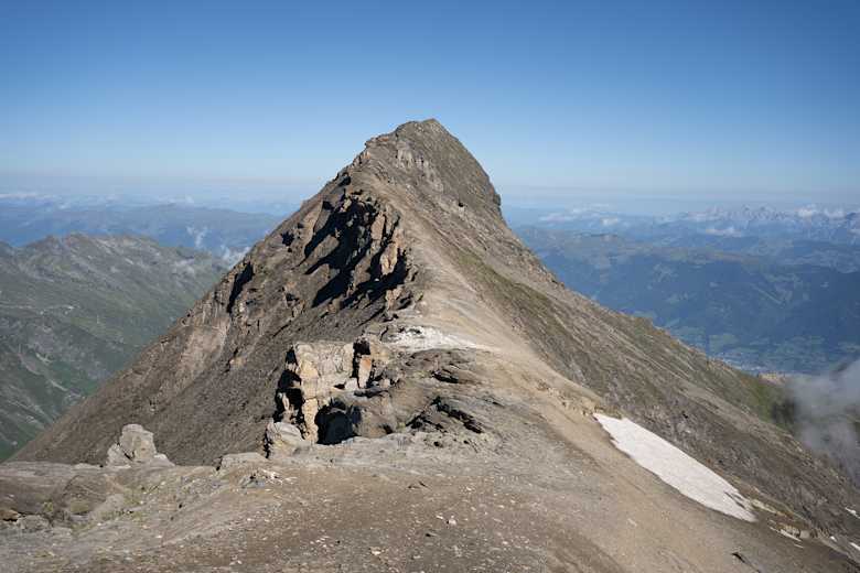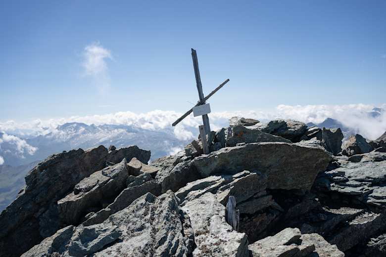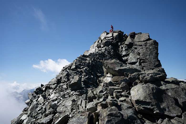 Das letzte Stück zum Gipfel des Hohen Tenn (3.368 m) weist die technisch schwierigste Stelle der Tour auf. Am bereits schmalen Grat weicht man einmal in die Felsflanke rechts aus und umklettert damit einen kurzen, schwierigen Bereich am Grat. Hier gibt es keine zusätzlichen Tritt- und Haltepunkte, es gilt mit gutem Gefühl und konzentriert zu steigen. Über Blockwerk erreicht man das schlichte und zierliche Gipfelkreuz.