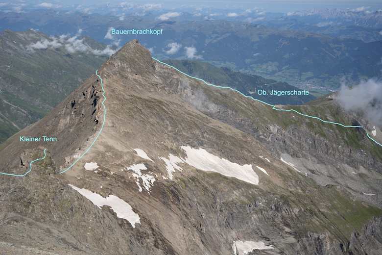 Ab der Oberen Jägerscharte verläuft die Route stets im Kammbereich. An der Abzweigung zum Mooserboden vorbei gelangt man auf den Kempsenkopf (3.090 m), dem nördlichsten Dreitausender der Alpen. Der Übergang von ihm zum Bauernbrachkopf (3.125 m) ist kurz und erfolgt am Kamm. Vom Bauernbrachkopf folgt man dem Kamm ein kurzes Stück abwärts, steigt rechter Hand in die SW-Flanke ab, und quert unterhalb steilerer Felsen wieder zurück zum Kamm. Bei dieser kurzen Umgehung der Gratlinie gut auf Wegspuren und Markierungen achten. Man befindet sich nun im flachen Verbindungsbereich zwischen Bauernbrachkopf und Kleinem Tenn.