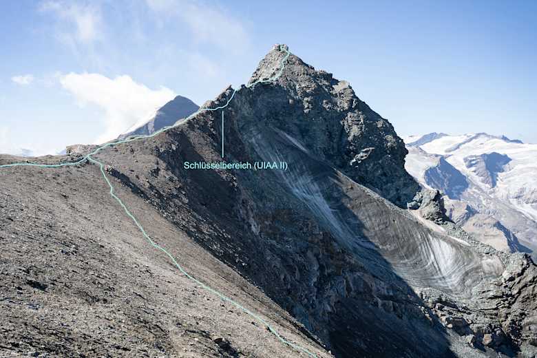 Der Gipfelaufbau des Hohen Tenn (3.368m). Der markante Felsen knapp oberhalb des sichtbaren Bergsteigers wird rechts umgangen (Schlüsselstelle). Foto: Matthias Knaus