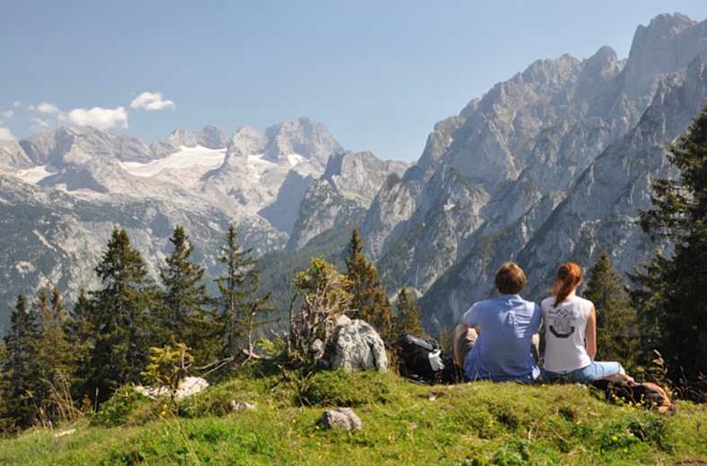 Auffahrt mit der Donnerkogelbahn (Betriebszeiten beachten). Von der Bergstation zur Rottenhofhütte und weiter über saftige Almböden zur Zwieselalmhütte bzw. weiter zur Gablonzerhütte. Kurzer, breiter Weg an der Sonnenalm vorbei zur Zwieselalmhöhe mit wunderschönem Rundblick zum Gosausee, Hoher Dachstein, Gletscher, Gosaukamm, Hohe Tauern, Trattberg, Gamsfeld und mehr.