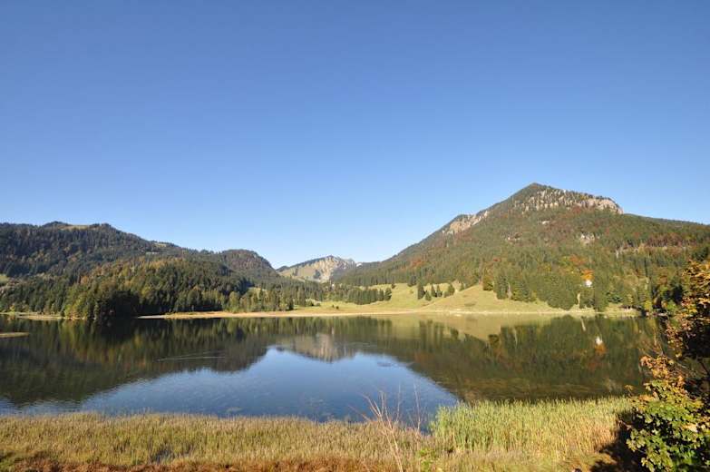 Nach nicht einmal 20 Minuten kommt eine Abzweigung nach rechts zur Albert-Link-Hütte (1.053 m). Der Bockerlbahnweg führt weiter geradeaus, kurz vor der Klausenhütte geht es auf die Seepromenade. Der Weg im Uhrzeigersinn um den See ist schöner. Weiter bis zur Nordspitze des Sees und dann noch über einen Weg gleich neben der Fahrstraße hinauf bis zum Spitzingsattel (1.130 m).