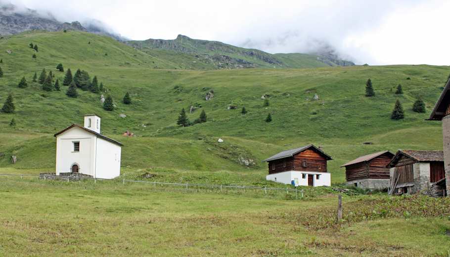 Über Plang Faller wandern wir zur Kapelle «Maria Heimsuchung», die seit bald 400 Jahren zum Innehalten einlädt. Im Weiler Tgà, einer ehemaligen Walsersiedlung, stehen Rundholzbauten neben gemauerten Häusern. Wir folgen dem Wanderweg über die Brücke des Ragn da Faller. Talauswärts führt ein Weg durch das Naturwaldreservat Val Faller, mit einem grossen Lärchen-Bestand. Wir aber wenden uns bergwärts in die wasserreiche Val Bercla.