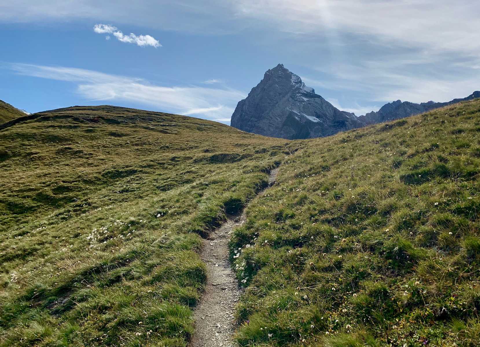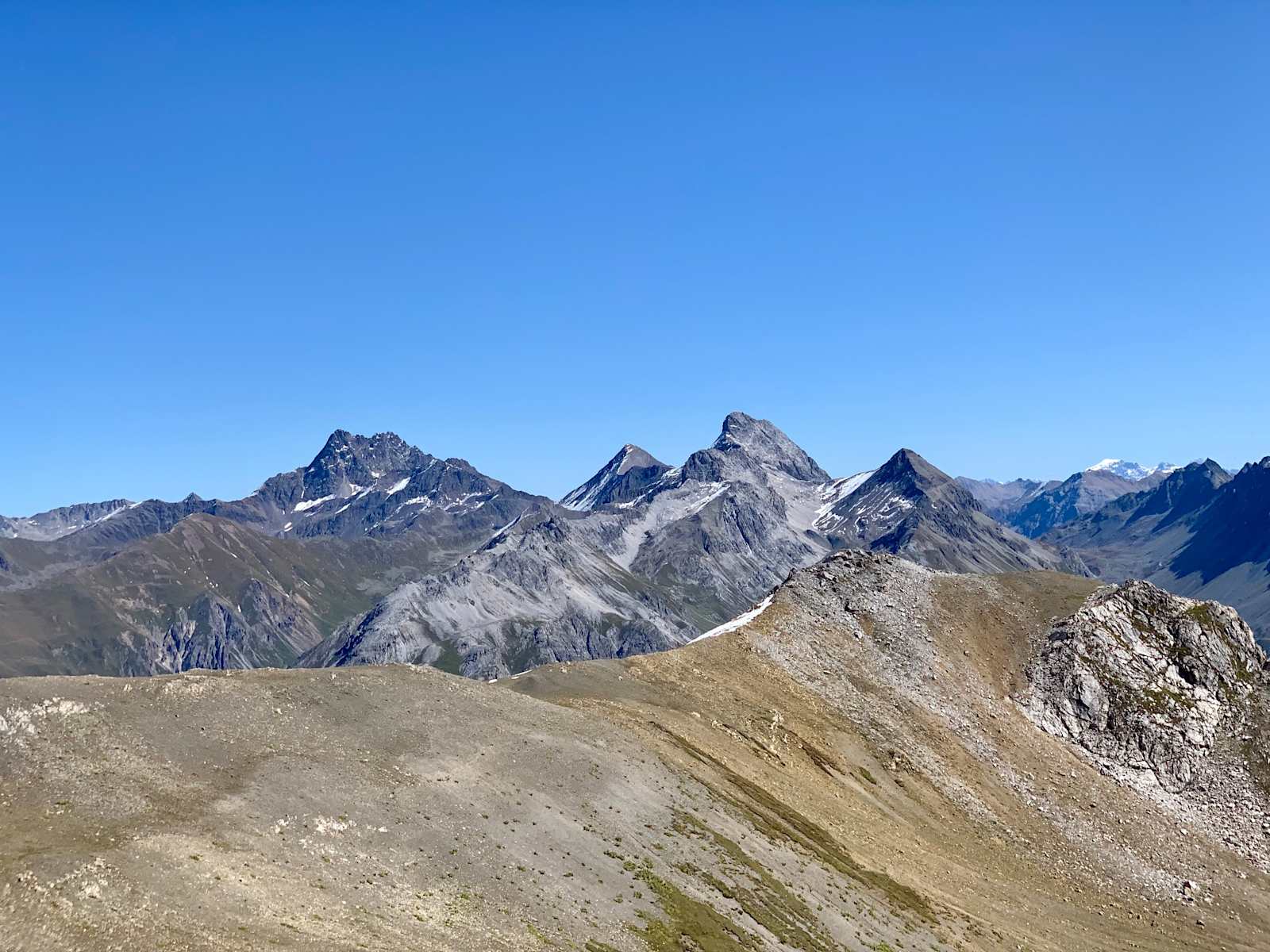 Mitten durch das felsige Amphitheater, gebildet vom Tinzenhorn und seinen Vorgipfeln, Piz Cuolmet und Piz Crap auf der rechten Seite, sowie dem Piz Ela mit Piz Spadlatsch, Piz Uglix und Piz Radond auf der linken Seite, führt der Trek hinauf auf den Pass. Felsschutt und Geröll dominieren hier. Flechten finden immer noch Lebensraum. Sie widerstehen gar Austrocknung und Frost. In der Verlandungszone des Lai Grond blüht das Wollgras und im Aufstieg zur Furschela da Tschitta leuchtet das Alpen-Mannsschild, ein flaches Polster bildend, in seinen Rosa-Tönen. Zuoberst am Berg beheimatet, gerät es durch die Klimaerwärmung immer mehr unter Druck. Unser Blick schweift über die Laiets zu den Gipfeln, die diese faszinierende Naturlandschaft krönen. Das Grün der Bergföhre löst die Erdtöne ab. Die Wasser aus der Val Tschitt und der Val Mulix vereinigen sich zu einem wilden Bach: die Rabgiugsa. Am Talausgang bildet der Wildbach einen schönen Schuttkegel, Bauplatz für die Maiensäss-Siedlung/Aclas Naz.