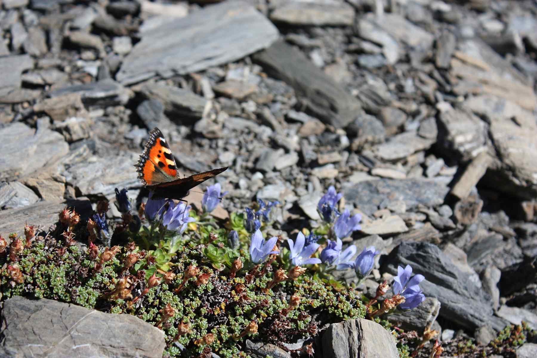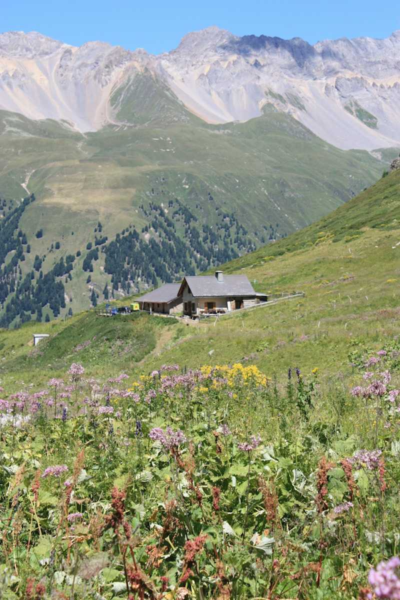 Über uns leuchten rot die Wände des Piz Cotschen, in der Ferne erhebt sich der 4000-er Piz Bernina. Dann beginnt der Aufstieg zur Fuorcla Pischa. Das Grün der Alpweiden kontrastiert mit dem Schiefer-Grau des Piz Blaisun. Im Kalkschutt blüht die seltene Mont Cenis-Glockenblume, besucht vom Kleinen Fuchs. Daneben ein alpines Blumenmeer – Enzian, Gletscherhahnenfuss und Steinbrech. Von der Fuorcla aus erblicken wir den Piz Ela, während sich am Piz Üertsch ein Blockgletscher talwärts schiebt. Schon liegen die Alpweiden der Val Plazbi vor uns, begrenzt durch die markante Ducan-Kette. Die Kühe machen Siesta, wir erfrischen die Füsse im Bach. Talauswärts, auf der Alp digl Chants, wird die Milch zu Alpkäse, Butter, Joghurt verarbeitet und im Kühlschrank verkauft – eine willkommene Aufbesserung des Proviants, bevor der letzte Aufstieg zur Keschhütte bevorsteht. Der Gletscherbach führt viel Wasser, um den Porchabella-Gletscher steht es schlecht. Das Piz Kesch-Panorama ist trotzdem berückend.