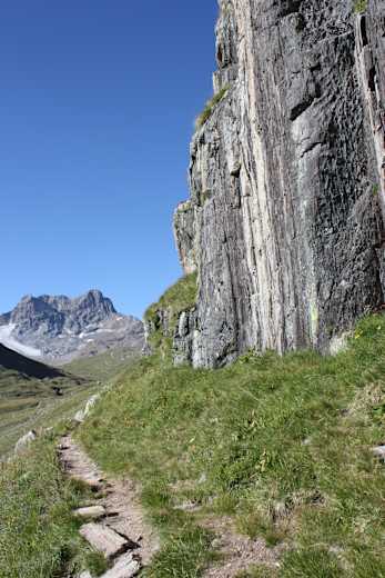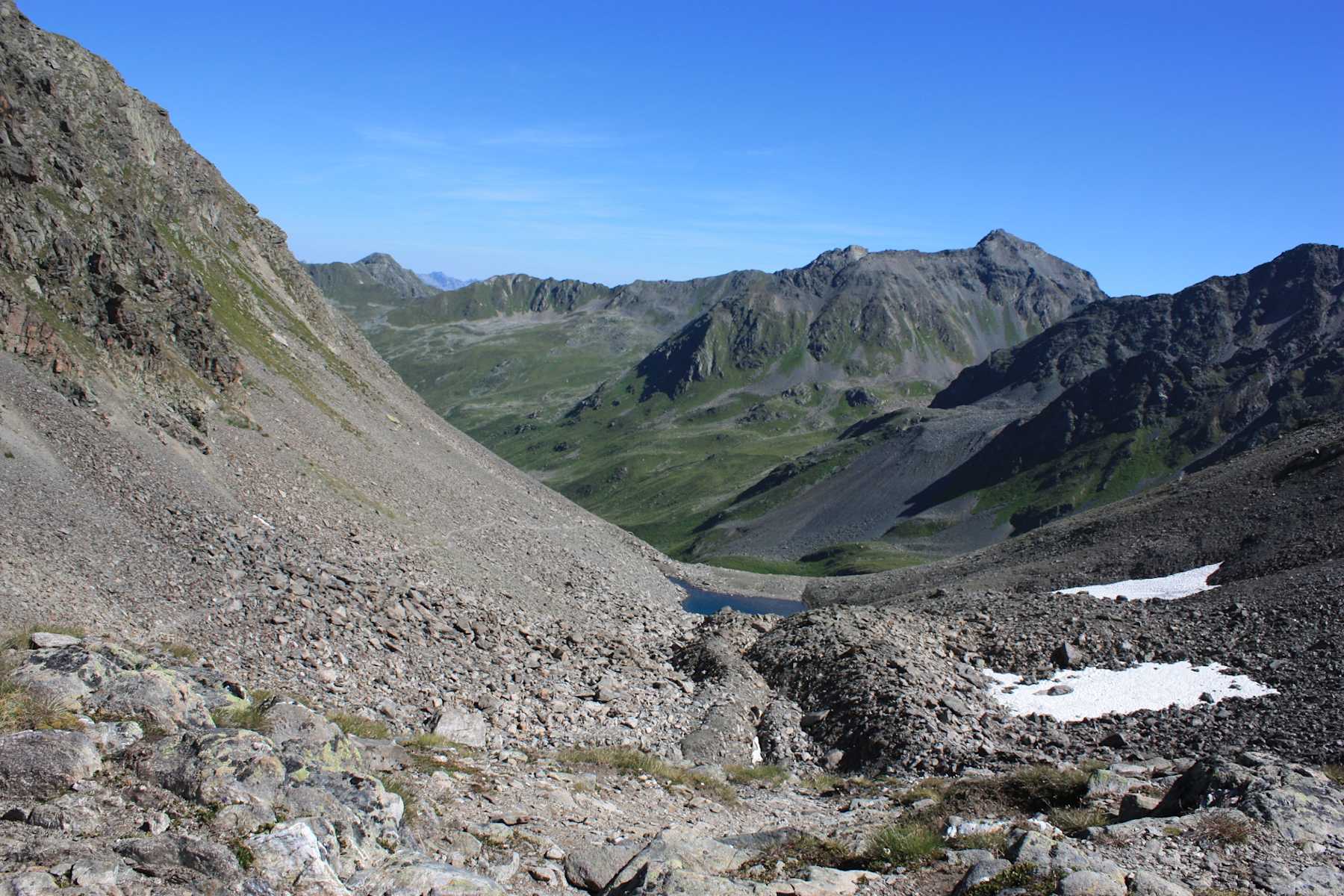Der Piz Kesch, ein Granit-Riese von 3417 Metern, begleitet uns noch durch die Val da Tschüvel. Weiter durch die Val Sartiv sind wir uns der Einzigartigkeit dieser alpinen Landschaft immer mehr bewusst. Vor uns liegen die Lai da Ravais-ch, dahinter erhebt sich die Ducankette mit seinen mächtigen Schutthalden aus Dolomitgestein. Das Kesch-Ducan-Gebiet ist als Landschaft von nationaler Bedeutung geschützt. Nach einer kurzen Steigung erreichen wir den Sertigpass. Das Chüealptal liegt vor uns. Über eine Steilstufe geht der Weg vom Felsschutt ins Alpweidegebiet der Atzungsgenossenschaft Hinter den Eggen über. Bim Schärä stehen die lawinensicheren Stallungen. Davor werden die Kühe gemolken. Die Alpmilch wird in der Molkerei Davos u.a. zu feinem Bündner Hobelkäse verarbeitet. Im Sertig fallen die schön aufgebauten Trockenmauern aus Lesesteinen auf. Diese Form der Weidepflege ergibt nicht nur schöne Bergwiesen und Alpweiden sondern auch wertvolle Lebensräume.