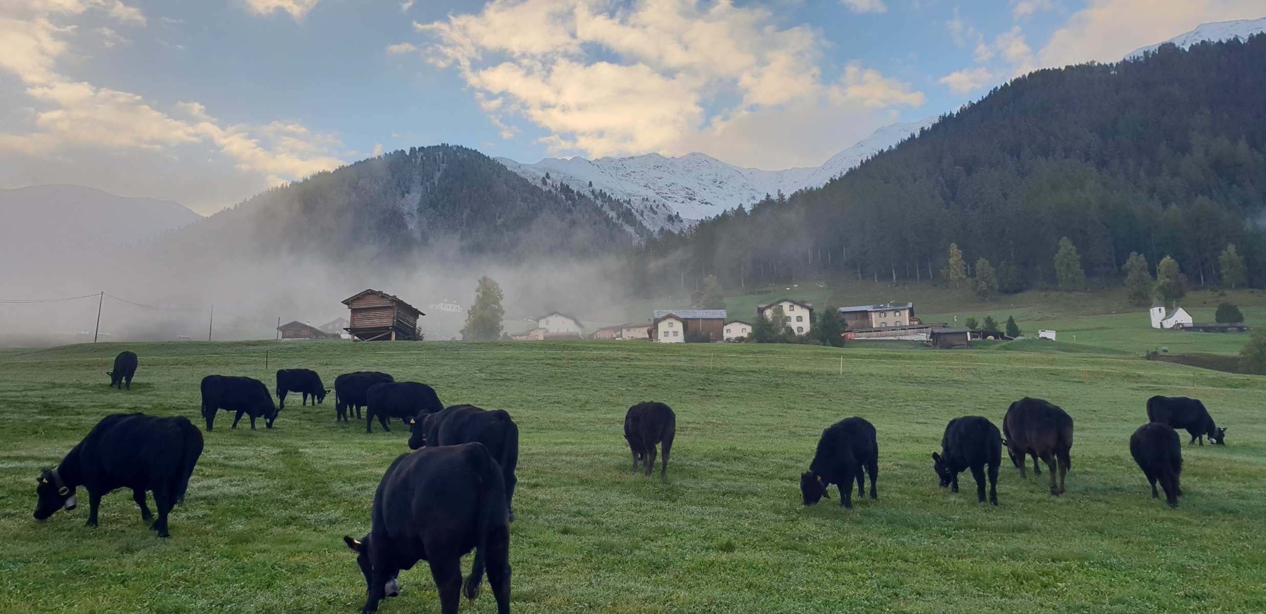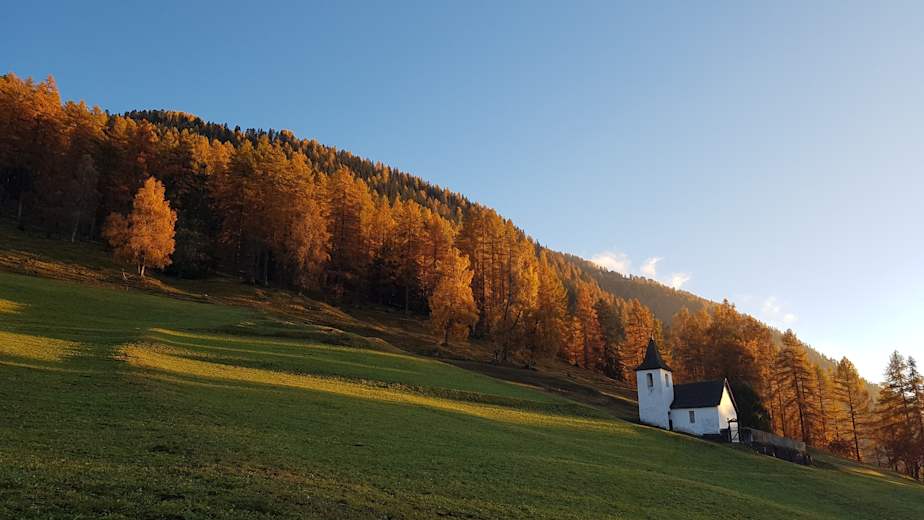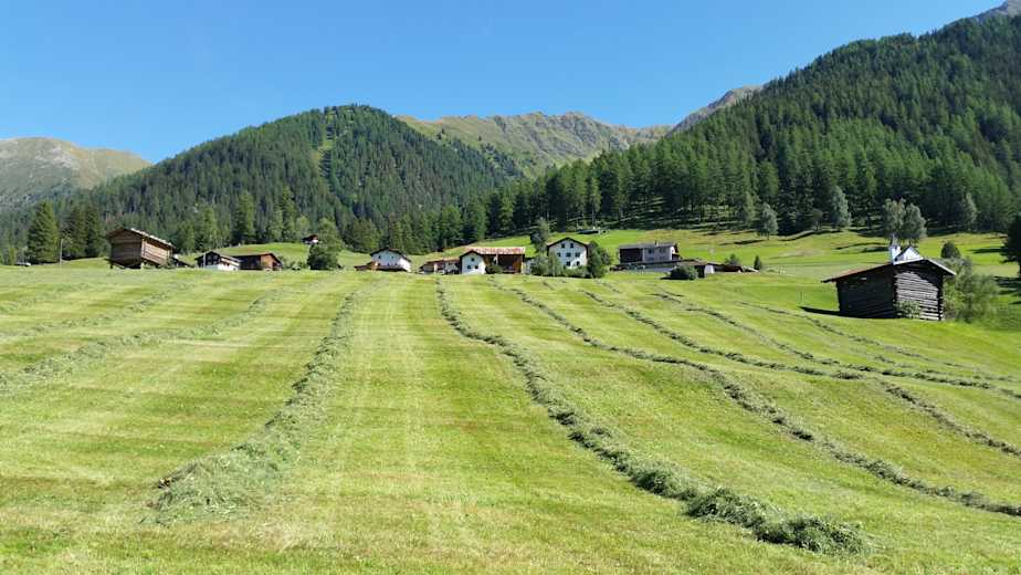 Schlicht und schön wacht das Kirchlein (1681) über Jenisberg. Am Rande der Heuwiesen stehen noch die alten Getreidespeicher. Von dort ist das Wiesner Viadukt, mit 87m die höchste Brücke der RhB, zu bestaunen. Durch den Müliwald verlassen wir das Walser Dörfli Jenisberg, das einem Adlerhorst gleich über dem Abgrund der Zügenschlucht klebt. Die Kunststrasse (1870/73) durch die Zügenschlucht, der wir bis Brumbänz folgen, weist tal- und bergseitig Trockenstützmauern und gemauerten Galerien auf. Bereits um 1500 entstand durch die Zügenschlucht der alte Zügenweg nach Davos, dem wir nun via Steighalda, Sagatobel und Mülitobel ins Oberdorf von Wiesen folgen. Der Name Zügen weist auf die zahlreichen Lawinenzüge hin. Via Eggelti und Rüggmad, mit den Heubarge, steigen wir zur Wiesner Alp hoch.