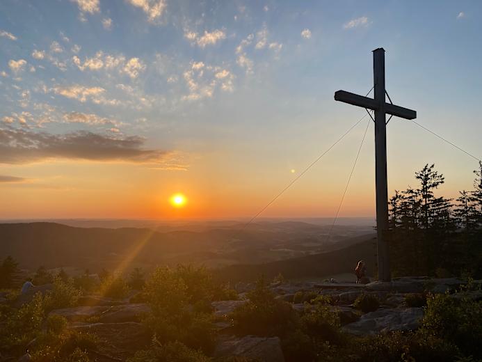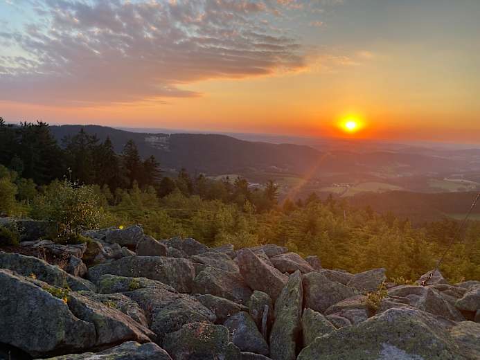 Vom Parkplatz geht's vorbei an beeindruckenden Felsformationen Richtung Pröller, dem Hausberg des Luftkur- und Wintersportortes Sankt Englmar. Auf dem Gipfel, einer der höchsten Erhebungen der Goldsteig-Südroute, genießt man den Blick auf die Berge an der Nordroute. Frühaufsteher werden besonders belohnt: Das Farbenspiel des Sonnenaufgangs über den Bayerwaldriesen sucht seinesgleichen und bietet einen fulminanten Start in den Tag.