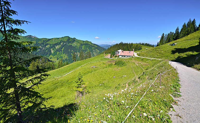 Der Abstieg von der Gräner Ödenalpe Richtung Rauth erfolgt über den Enziansteig und verläuft weiter bis zum Parkplatz des Krinnenalplifts.