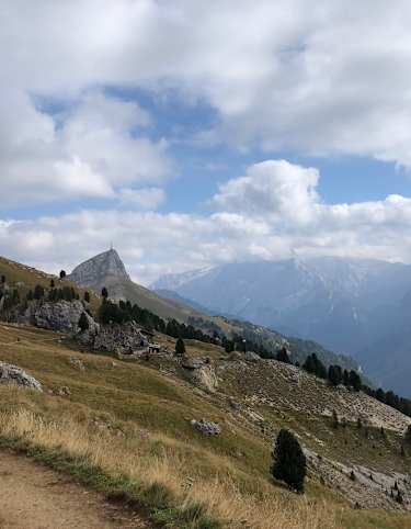 Man nimmt die Seceda-Seilbahn von St. Ulrich und fährt bis zur Bergstation auf 2.453 m. Von wandern man nun gemütlich und aussichtsreich abwärts bis zur Daniel Baita Hütte.