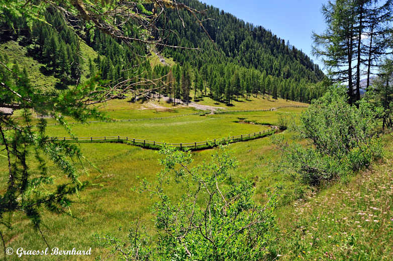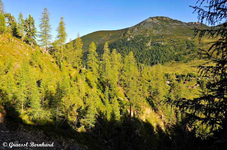 Vom Sadnighaus wandert man die Zufahrtstraße bis zur ersten Kehre zurück, dann geht es in den Talboden hinab. Den Weg folgend zum Bach hinab und über einen Steg zum Waldhang gegenüber (Wegtafel). Dort im dichten Lärchenwald zunächst schräg rechts empor bis auf eine Lichtung. Darauf länger links, Tal einwärts, wieder durch Wald entlang, eine Bachquelle passierend bis man auf Weidehänge gelangt. Bald schlängelt sich der Steig flacher über einen hügeligen Hangabsatz und erreicht am Kabitzenbühel, eine Weggabelung.
