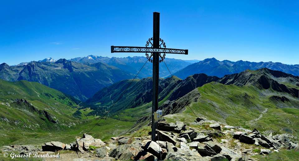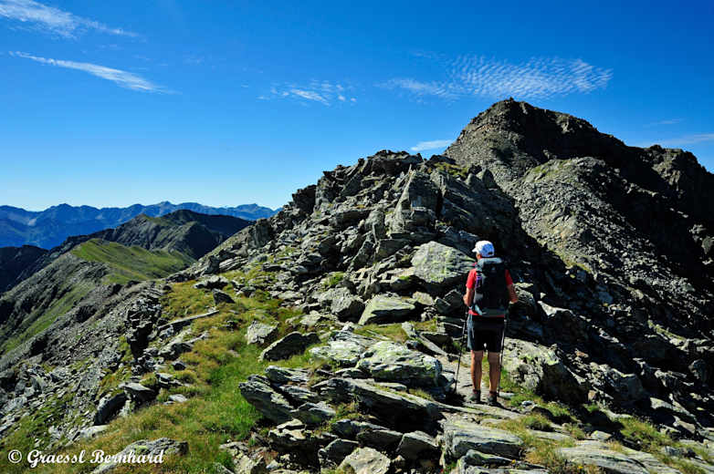 Rechts haltend weiter über zunehmend schrofigere Hangstufen geht es schließlich auf die Sadnigscharte auf 2484m. Nun rechts über einen kurzen, welligen Bergrücken an eine hohe Flanke, die man zunächst auf einer begrünten Rampe rechts ansteigt, dann durch ein Blockfeld nach links und darauf über die linke Flankenkante den Gratfirst erreicht. Über den felsigen Grat im leichten Auf und Ab, bis unter den markanten Gipfelkopf, den man über steilere Felsblöcke und -stufen überwindet.