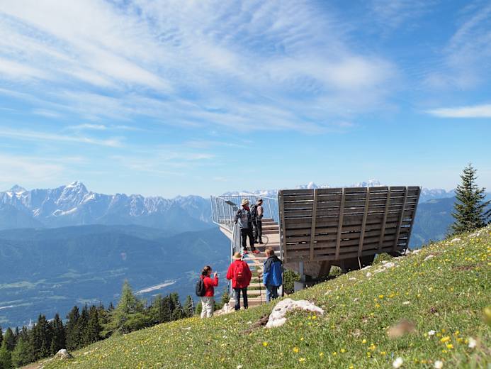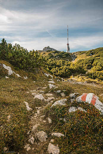 Kurz nach Betreten des Weidegebietes (Weidegatter) folgt man der Schotterstraße Weg Nr. 291 bis zur ersten Kehre und zweigt Richtung Gams- und Gipfelblick ab. Nach der kurzen aussichtsreichen Rast geht es wieder zurück zum Hauptweg und folgt der Schotterstraße bergauf bis zum nächsten beschilderten Abzweiger. Hier zweigt der Weg Nr. 294 Richtung 10er ab und man erreicht die ehemalige Bergstation mit vielen interessanten Informationen zur Geschichte des Berges innerhalb des Gebäudes.