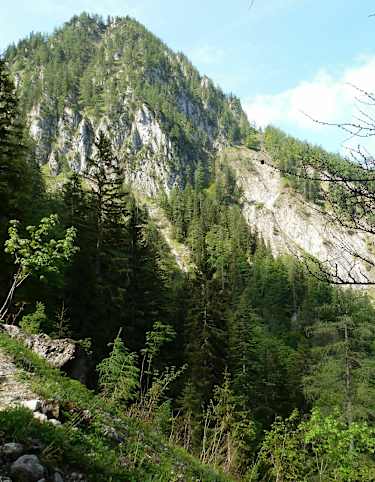 Wir starten in der Hinterradmer (898 m) und gehen - an dem Feuerwehrgebäude vorbei - die Straße durch das besiedelte Gebiet bergauf. Nach den letzten Häusern führt der Wanderweg leicht bergauf durch den Wald und in ein bizarres Bergsturzgebiet. Je höher wir kommen, desto steiler wird der Aufstieg. Nach geraumer Zeit durchqueren wir eine steile Felswand, wobei der Steig gut zu gehen ist und eine Seilversicherung zusätzlich Sicherheit gibt.