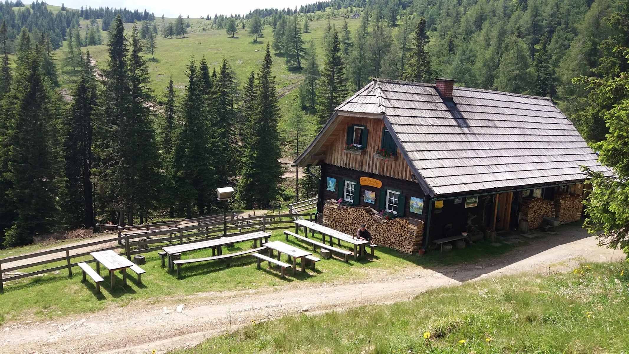 Wir starten unsere Wanderung bei der Knödelhütte. Wir halten uns rechst und gehen der Wanderwegmarkierung 505 folgend über die Almwiese stetig bergauf. Nach ca. 1 km erreichen wir den Waldrand und unser Feldweg mündet in einen Waldweg ein. Wir bleiben auf dem Weg mit der Markierung 505 bis wir die Bernsteinhütte erreichen, wobei es mäßig bergauf geht. Da wir aber durch den Wald gehen, kommen wir nur bedingt zum Schwitzen. Nach guten 2,5 km erreichen wir unsere erste Einkehrmöglichkeit, die Bernsteinhütte. Diese liegt zu unserer rechten Seite auf einer wunderschönen Almlichtung, wo wir einen fabelhaften Aussichtspunkt haben. Haben wir unsere Kraftreserven wieder aufgetankt, wandern wir weiter.