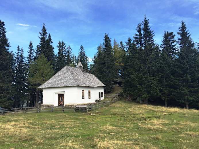 Wir gehen den Weg Nr. 45 bis wir das Bartholomäer Kircherl sehen, haben wir dieses besichtigt, gehen wir ein kurzes Stück zurück und gehen bei der Wanderweg-Kreuzung halb rechts den Weg 540 zum Seiner-Kreuz. Es geht noch stetig bergauf und beim Seiner-Kreuz haben wir den höchsten Punkt unserer Wanderung über die Bartholomäer Alm erreicht. Wir treffen schließlich auf den Weg Nr. 505 und gehen jetzt Richtung Bernsteinhütte links. Es geht gemütlich dahin, nach kurzer Zeit geht es mäßig bergab und wir erreichen schließlich die Weggabelung, wo links der Weg mit der Nr. 540/538 abzweigt (dieser liegt kurz vor der Abzweigung, wo wir bei unserem Hinweg jene zur Saureishütte genommen haben).