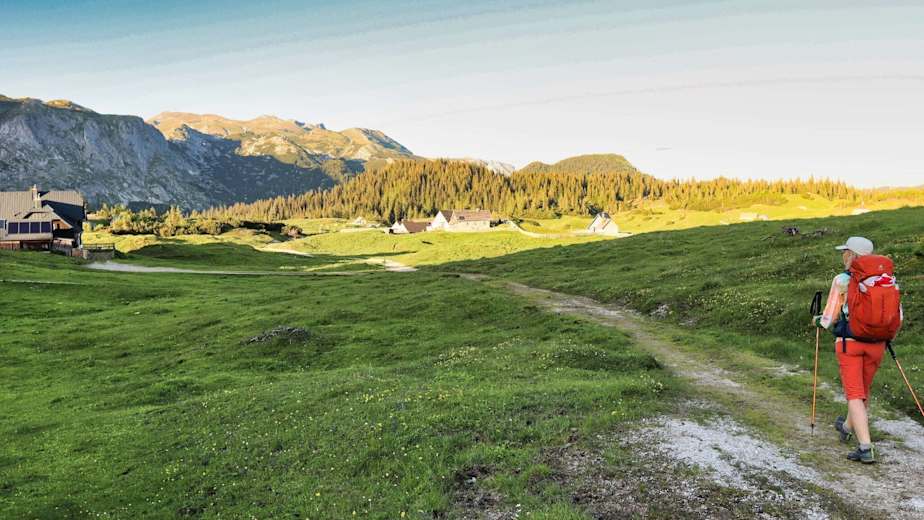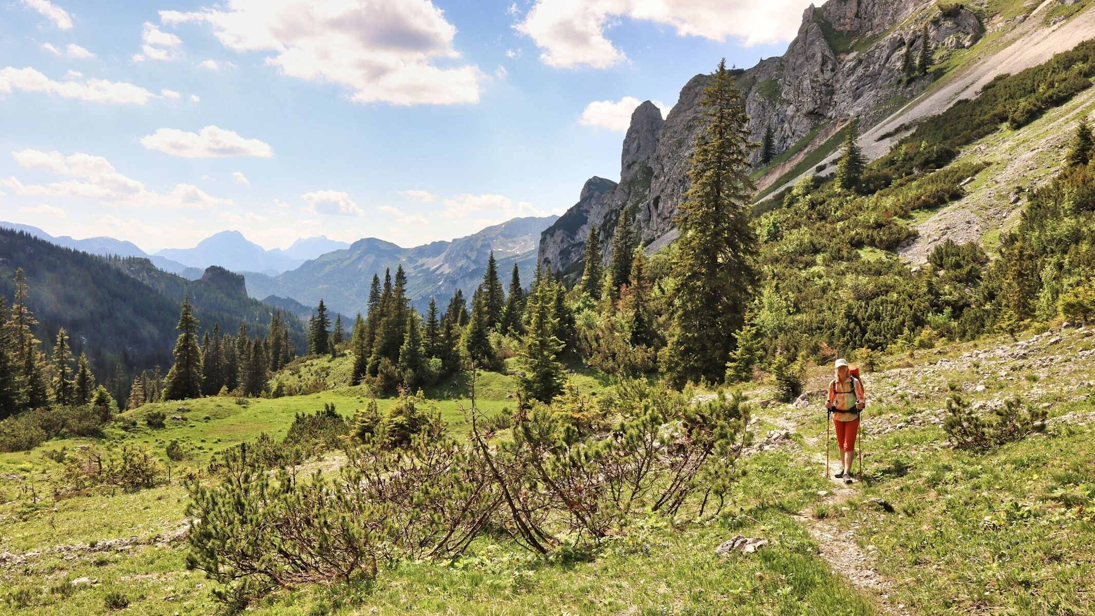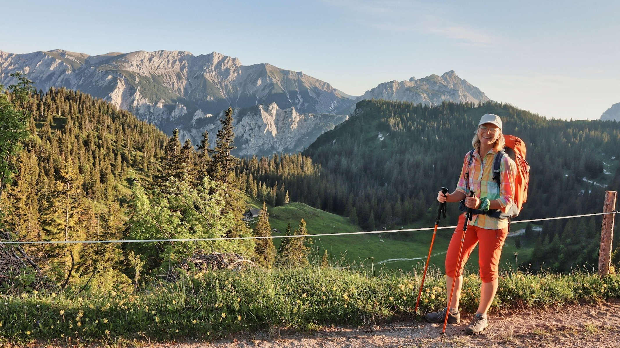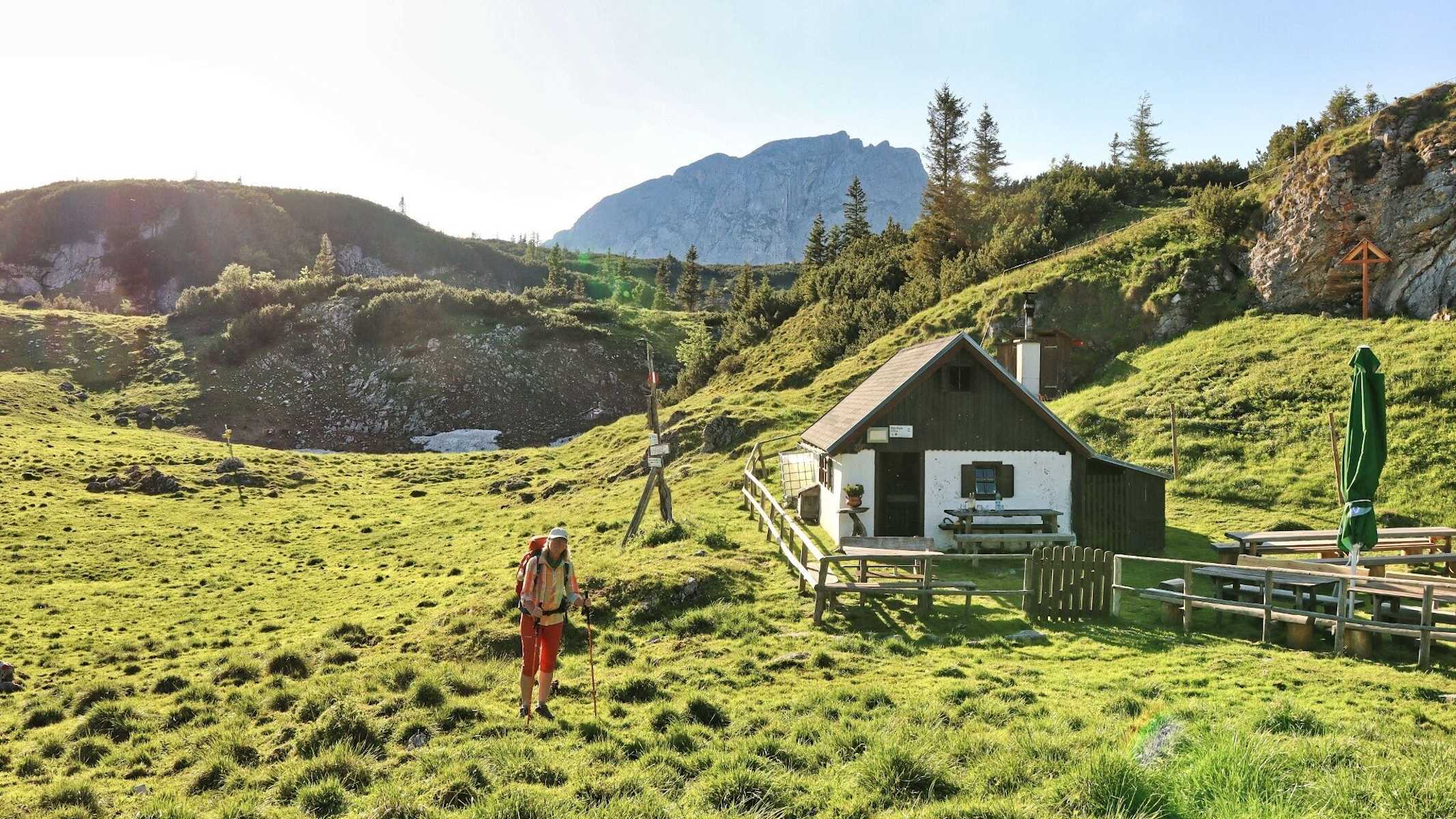 Weiter wandern wir über eine zum Teil mit Latschen verwachsene Dolinenlandschaft über das Fobistörl, 1.544 m, bis zur bewirtschafteten Androthalm, 1.556 m. Ab hier ist es ein gemütliches Auf und Ab auf einer Seehöhe von ca. 1.500 m. Wir passieren den Wegpunkt Stoanbrunn und gehen in Folge oberhalb der Senkbodenalm zur Sonnschienalm, 1.523 m, mit der in der Mitte der großen Almfläche liegenden Sonnschienhütte.
