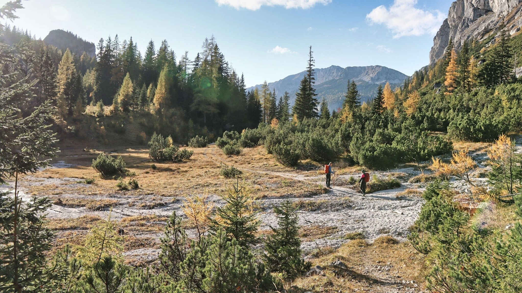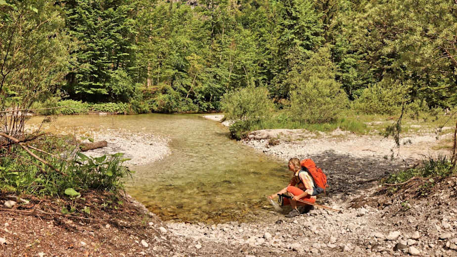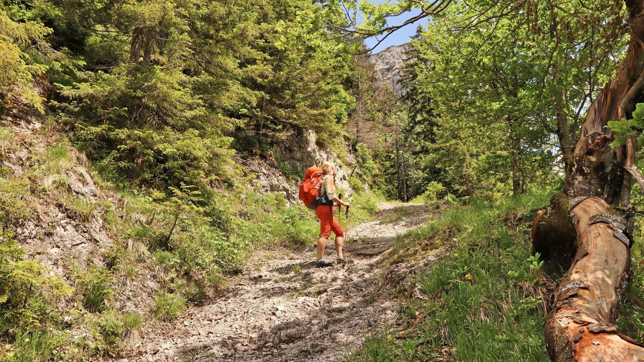 Nahezu eben verläuft der Weg entlang des Seeaubaches taleinwärts, bis wir nach ca. 3 km ein Wildgatter erreichen. Hier folgen wir nach rechts der Forststraße, die durch die Klamm, über Holzbrücken und an einer Holzhütte vorbei durch den Hinterseeaugraben führt. Wir bleiben immer auf dem Weg, der ca. 200 Höhenmeter steil bergauf durch den Wald ansteigt. Auch danach geht es kontinuierlich bergauf, mit schönen freien Blicken auf die Kalkwände bis zur Jagdhütte auf der Fobisalm, 1.394 m. Hier gibt es einen Brunnen in der Nähe der Jagdhütte, wo Wasser nachgefüllt werden kann.