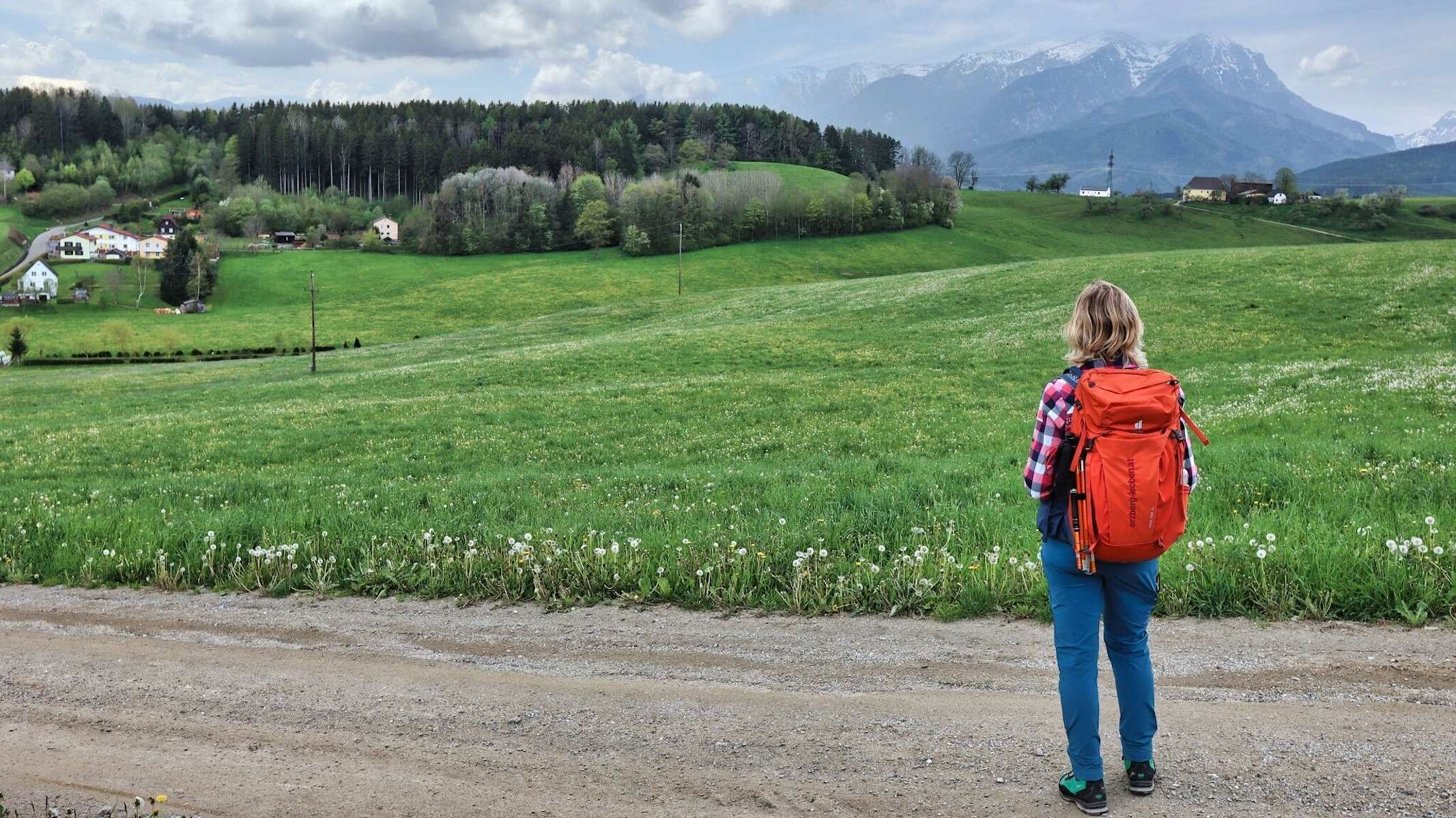 Durch das Zentrum und weiter über den Vordernberger Bach führt der Wanderweg am Schloss Mell vorbei, bis wir nach wenigen Höhenmetern bergauf das Mellplateau und den Landschaftsbilderrahmen erreichen. Wir zweigen rechts ab und folgen der Schotterstraße, die über gepflegte Kulturflächen führt, bis zum Talboden des Laintalbaches. In der kleinen Ortschaft Wolkersdorf zweigen wir links ab, wandern entlang einer Forststraße über Wiesenflächen und durch den Wald bergauf.