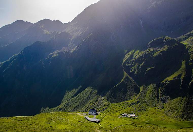 Blick hinunter auf die Potsdamer Hütte im Fotschertal Foto: Potsdamer Hütte