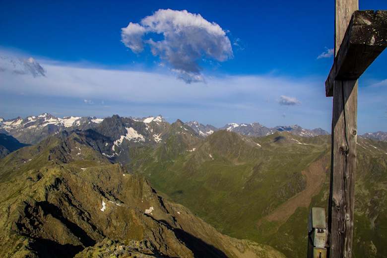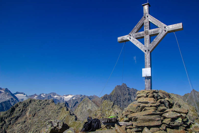 Die Tour startet an der Potsdamer Hütte (2.020 m) und führt zunächst auf markierten Pfaden in östlicher Richtung hinauf zum Schwarzhorn (2.812 m). Der Anstieg verläuft durch offenes, alpines Gelände und bietet unterwegs immer wieder tolle Ausblicke ins Lüsenstal und zum Roten Kogel. Oben wartet ein ruhiger Gipfel mit überraschend weitreichender Rundumsicht.