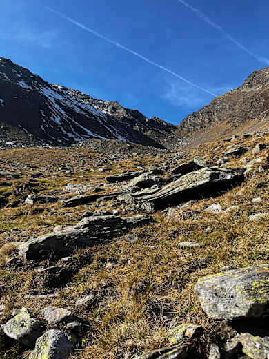 Der Abstieg erfolgt über einen steinigen, aber gut begehbaren Steig durch das weite Kar und weiter über Almgelände zur Talstufe von Lüsens (1.634 m), wo sich der Alpengasthof Lüsens zur Einkehr oder als Etappenziel anbietet.