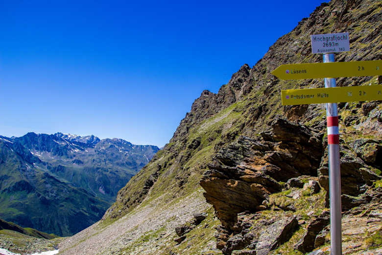 Diese stille und aussichtsreiche Wanderung (T3) führt von der Potsdamer Hütte (2.020 m) über das wenig begangene Hochgraffljoch (2.693 m) und im Anschluss hinunter ins malerische Lüsens in den Stubaier Alpen in Tirol. Der Alpengasthof Lüsens mit tollem Blick auf den Lüsener Fernerkogel bietet eine willkommene Einkehrmöglichkeit.