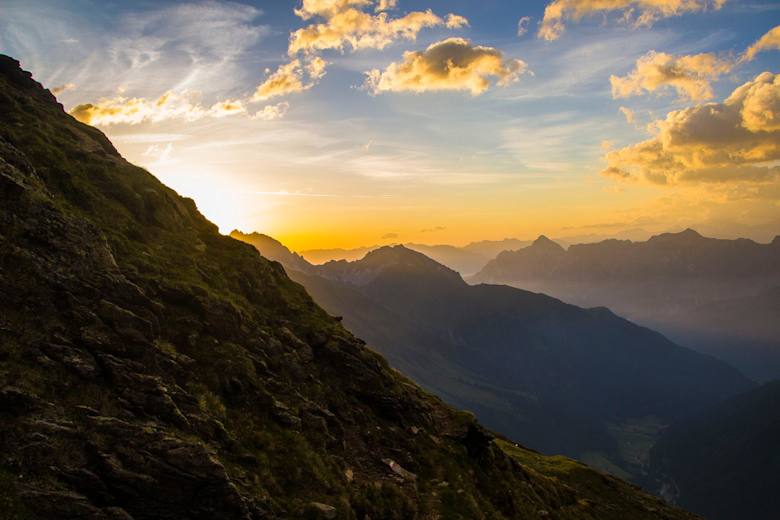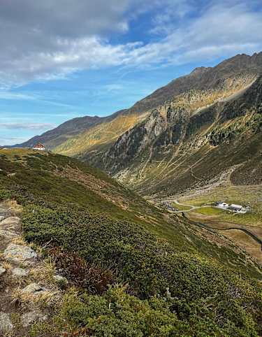 Der schmale Steig führt durch steile, grasige Flanken, quert mehrere kleine Bäche und bleibt durchgehend aussichtsreich. Man hat hier fantastische Blicke auf die Gletscher der südlichen Stubaier Alpen. Kurz vor der Hütte gewinnt man noch einmal leicht an Höhe, bevor die Franz-Senn-Hütte (2.147 m) auf einer sonnigen Terrasse erscheint.