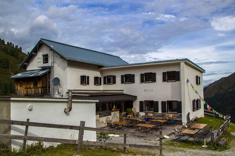 Der Abstieg erfolgt nordseitig über einen steilen, teils schottrigen Steig hinab ins Senderstal. Die Route führt schließlich über weite Almböden zur Adolf-Pichler-Hütte (1.977 m).