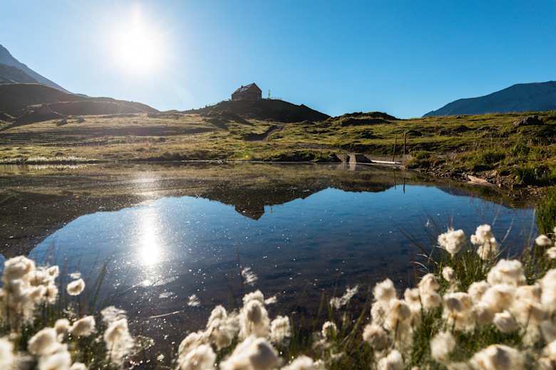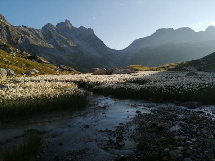 Erstes Licht über Wollgrasfeld in den Niederen Tauern Foto: Franz-Fischer-Hütte