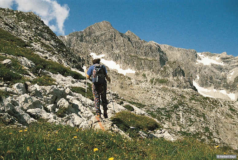 Am zweiten Tag lenkt ein Wegweiser auf den zur Braunarlspitze führenden Fürggeleweg. Der Alpweg, eine Etappe des Europäischen Fernwanderwegs E 4 alpin sowie des Großen Walserwegs, bringt uns über Weideböden hinunter zur nahen Schadona-Alpe. Über dem Talschluss des Großen Walsertals geht es anschließend bequem zu der auf einem Absatz des Rothorn-Südwestrückens stehenden, kleinen Litehütte, 1.836 m. Der bald eine Weile mäßig steigende Steig verflacht unter dem Ross wieder und quert unbedeutende Geröllhalden. Oberhalb der Lägerzun-Jagdhütte folgt aus einer quellenreichen Hochwanne ein Aufschwung durch eine kleine Mulde ins Fürggele, 2.145 m, zwischen Hochberg und Braunarlspitze. Hinter dem Kar der sogenannten Hochgletscheralpe baut sich die Mohnenfluh auf, über dem Hochtannbergpass grüßt der Widderstein.