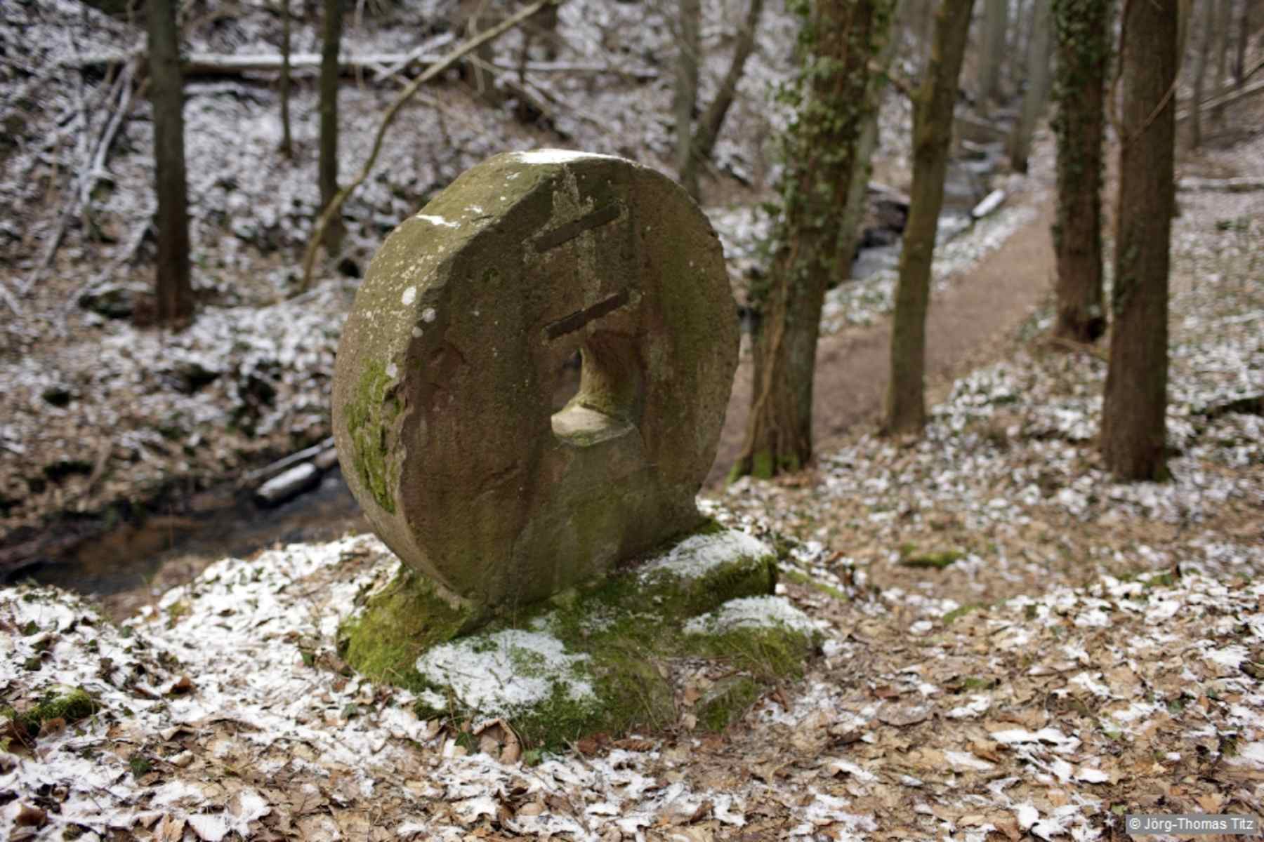 Wir wandern weiter am Bach entlang (rotes Dreieck und roter Punkt). Nach 150 m können wir etwas oberhalb des Bachs einen alten Mühlstein entdecken. Hier stand einmal die Platsche Mühle, eine Mahl- und Schleifmühle, die 1821 erbaut und um 1900 stillgelegt wurde. Auch von der Unteren Eselsmühle sind noch Reste vorhanden, ein alter Mahlstein und ein Stück des aus Sandstein gehauenen Wasserkanals. Diese Mühle wurde 1718 erbaut, 1886 ist sie abgebrannt.