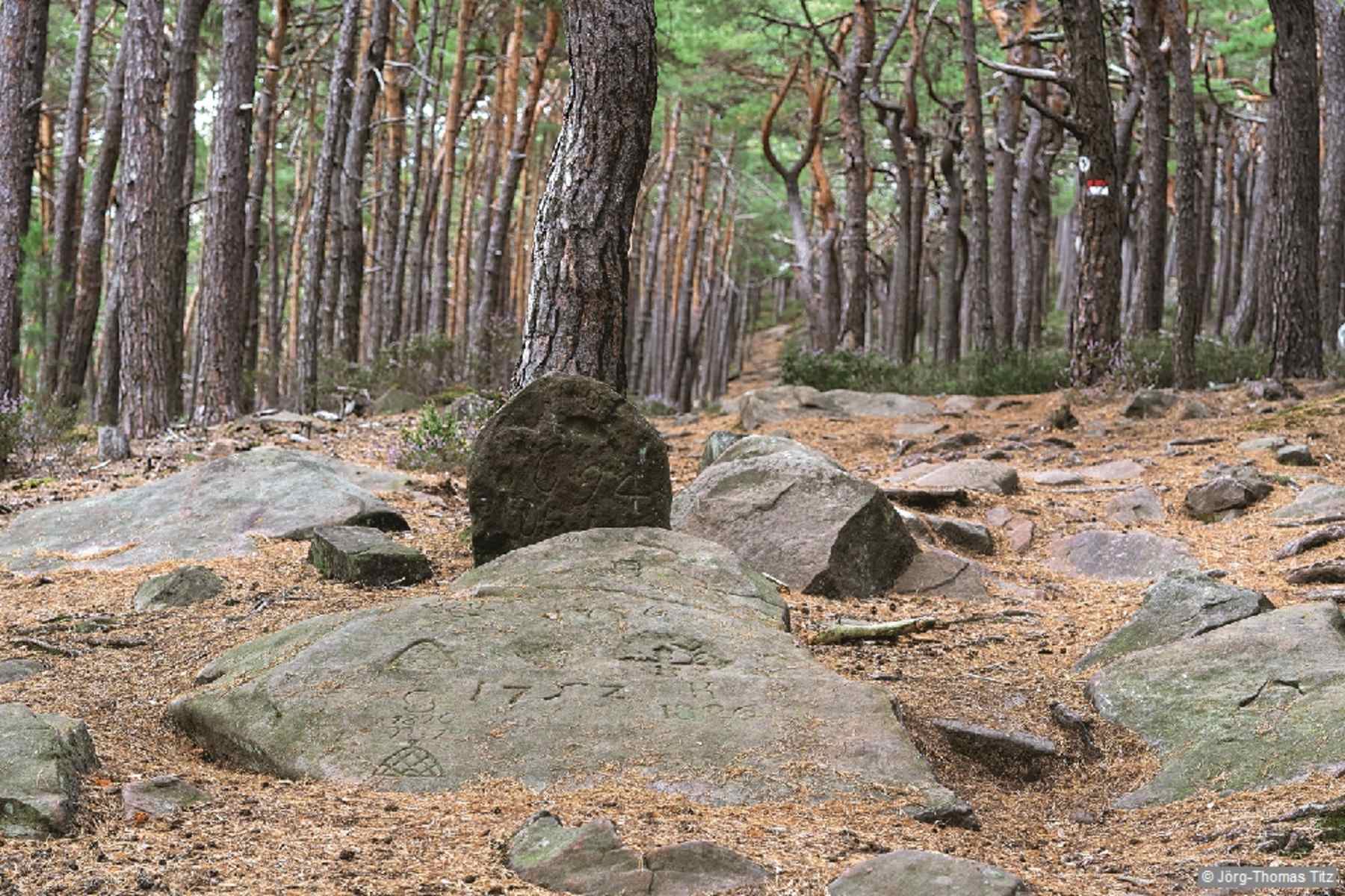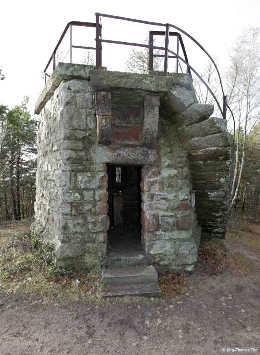 1874 wurde an dieser Stelle das Forsthaus Benjental erbaut, in dem wir einkehren können. Wir wandern weiter am Bach entlang (rotes Dreieck und roter Punkt). Foto: Jörg-Thomas Titz, Bergverlag Rother GmbH Wir kommen am Hohlen Fels vorbei, in dem die Deidesheimer Freiheitskämpfer des Jahres 1848 Unterschlupf fanden. Danach treffen wir auch wieder auf den roten Punkt. Foto: Jörg-Thomas Titz, Bergverlag Rother GmbH Wir erreichen die bewirtschaftete Looganlage, ein ehemaliges Jagdhaus. Nächste Mühle am Weg ist die Eselsmühle, eine ehemalige Wappenschmiede und Schleifmühle (1710 erbaut, 1860 abgebrannt). Foto: Jörg-Thomas Titz, Bergverlag Rother GmbH Von der Sängerklause leitet uns der rot-weiße Strich rechts zu einem Sandstein, in den Jahreszahlen und andere Zeichen eingemeißelt sind, und zum Heide-Stühler-Platz. Foto: Jörg-Thomas Titz, Bergverlag Rother GmbH Der 6 m hohe Turm wurde 1904 vom Pfälzerwald-Verein als erster und somit heute ältester Aussichtsturm erbaut. Hier können wir rasten und die Aussicht über Neustadt an der Deutschen Weinstraße und die Rheinebene genießen. Foto: Jörg-Thomas Titz, Bergverlag Rother GmbH Bildergalerie (5)