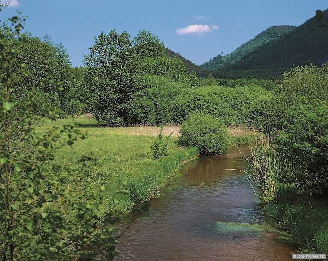 Vom Biosphärenhaus in Fischbach folgen wir 250 m der roten Raute entlang der Straße in Richtung Ortszentrum. Wir überqueren diese und wandern links auf dem grün-gelben Strich und dem Felsenland-Sagenweg (Gespenst) in den Königsbruch, wo wir nach 1,5 km beim Sportplatz links ein Stück in das Naturschutzgebiet bis zum Saarbach hineingehen, kehren dann um und wandern auf dem grün-gelben Strich 1,5 km weiter durch das Tal, bis von rechts der grüne Strich auf unseren Weg trifft.