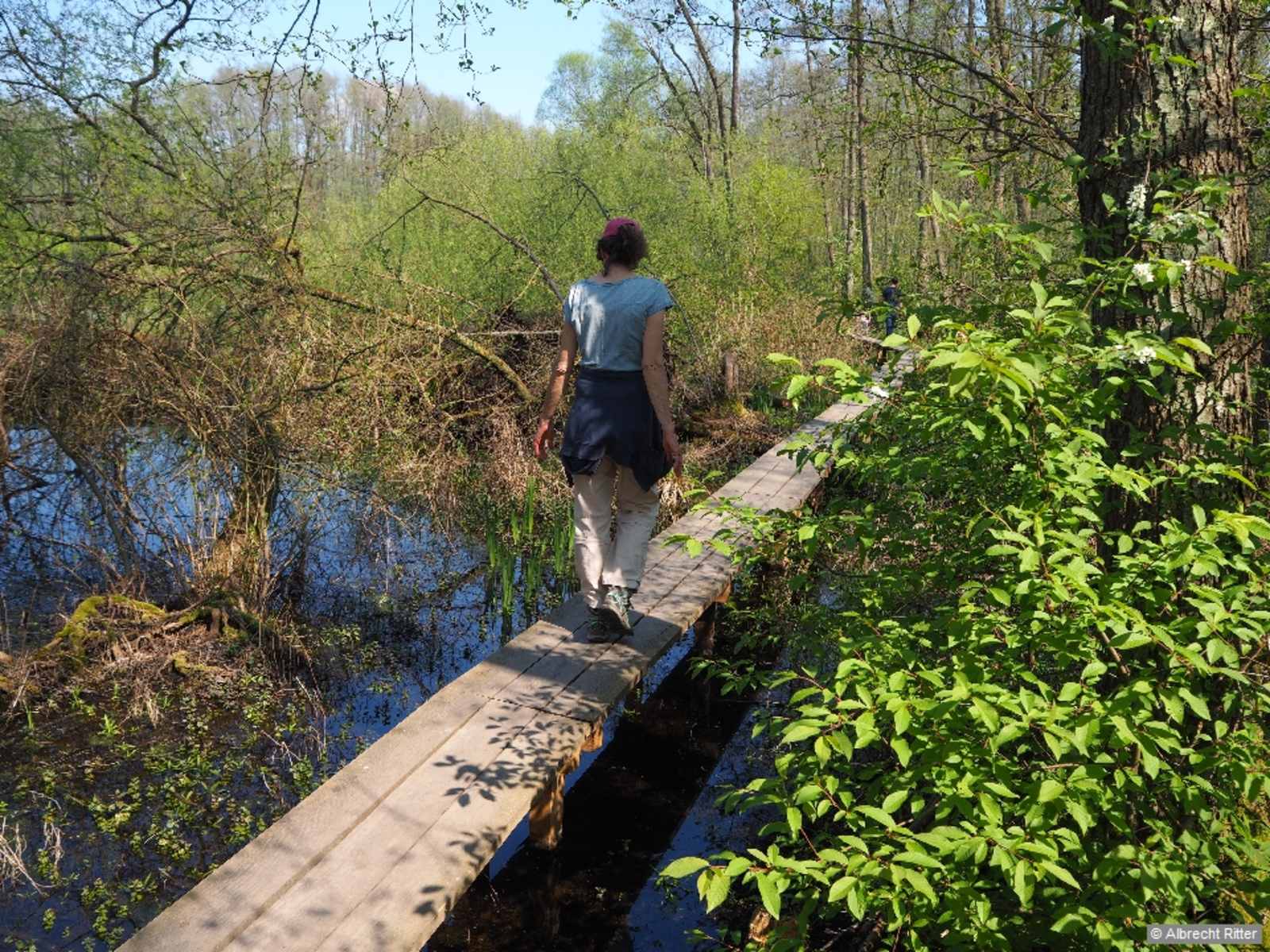 Ein Holzbohlensteg führt uns zu einer Vogelbeobachtungsstation im Weingartener Moor. Foto: Albrecht Ritter, Bergverlag Rother GmbH