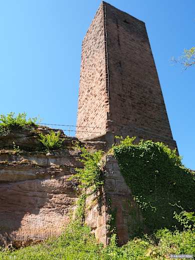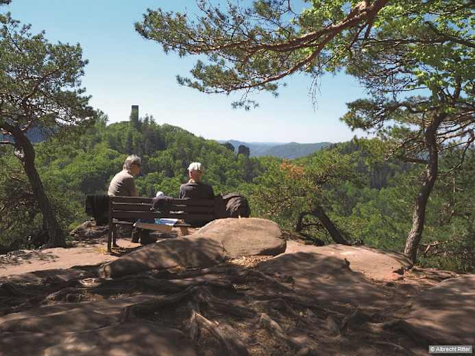 Zurück an der Kreuzung gehen wir geradeaus weiter in Richtung Trifels. Am Hexentanzplatz, an dem sich zahlreiche Wege kreuzen, nehmen wir den gegenüberliegenden Pfad, der zwischen zwei Wegen im Zickzack den steilen Hang hinaufführt. Wer sich den Anstieg ersparen möchte, folgt geradeaus dem Wegzeichen des Pfälzer Weinsteigs. Oben bei Tafel 10 angekommen, halten wir uns rechts und steigen nach 20 m halb links bergauf. Im Halbbogen geht es unterhalb des Abflugplatzes der Drachenflieger vorbei und anschließend nach Tafel 9 über den Kamm des Föhrlenberges. Wir behalten die Richtung bei, überqueren zwei Forstwege und kraxeln nach Tafel 8 steil bergab. Es folgen zwei herrliche Aussichtspunkte auf die Burg Trifels und die Münz gegenüber. Am unteren, als Slevogtfels bekannt, biegen wir in spitzem Winkel links ab. Achtung: Leicht zu übersehen – nach 100 m nehmen wir den scharf nach rechts abgehenden Pfad. Wir stoßen auf einen Forstweg, halten uns rechts und verlassen ihn nach 30 m nach links auf einen Weg, der uns zum Wanderparkplatz Ahlmühle bringt. Wir überqueren die Straße und halten uns nach 20 m an der Verzweigung rechts. Bis zu Tafel 3 des geologischen Wanderpfades bleiben wir auf dem steilen und schmalen Steig. An der Infotafel schwenken wir nach rechts und erreichen nach wenigen Minuten den gut erhaltenen mächtigen Bergfried der Burgruine Scharfenberg, die auch unter dem Namen Münz bekannt ist. Sie stammt aus dem 12. Jh. und wurde nach zeitweiliger Nutzung als Staatsgefängnis im Bauernkrieg 1525 zerstört.