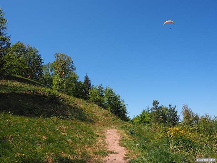 Wir wandern oberhalb des Slevogthauses vorbei und folgen für geraume Zeit dem Themenweg. Bei Tafel 4 machen wir nach rechts einen Abstecher zur Ruine Neukastel, von der nur wenige Mauerreste erhalten sind.