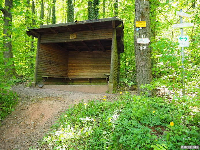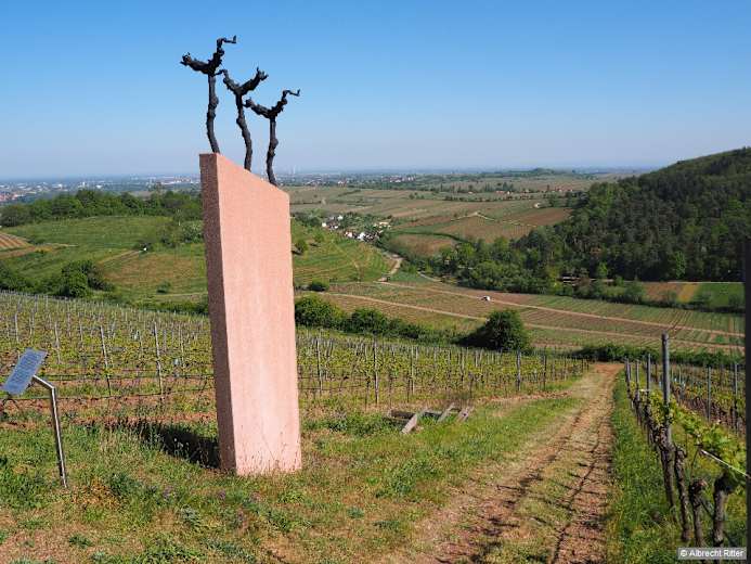 Nun heißt es, sorgfältig aufpassen: Der Weg taucht nach rechts in den Wald, verliert sich fast, stößt aber nach einem leichten Rechtsbogen auf einen anderen, steil bergauf führenden Pfad, der uns zu einer Lichtung führt. Am Sport- und Spielplatz halten wir uns links und gehen unterhalb der Kolpinghütte vorbei. Aus dem Wald austretend, senkt sich unser Weg ins Tal und stößt auf einen asphaltierten Weinbergsweg. An einer Kreuzung angelangt, biegen wir in spitzem Winkel links ab und wandern talwärts. 50 m nach dem Sandsteinkreuz an der Verzweigung folgen wir dem Wanderzeichen Deutsche Weinstraße mit der grünen Traube. Vor den ersten Häusern des Örtchens Ranschbach biegen wir an einer Sitzgruppe in spitzem Winkel nach rechts ab und nehmen an zweiter Möglichkeit den Links-Abzweig. Am Waldrand weist die Markierung nach rechts, und wir erreichen eine Kreuzung mit Opas Bank, an der wir mit weitem Blick in die Rheinebene geradeaus fortsetzen. An einer gewaltigen Eiche am Waldrand nehmen wir den halb rechts führenden Weg hoch in den Wald (Schild Slevogthof). Der berühmte Impressionist Max Slevogt (1868–1932) erwarb 1914 den ehemaligen Gutshof von seinem Schwiegervater und malte dort bis zu seinem Tod eine Vielzahl farbenprächtiger Landschaftsbilder. Eine Auswahl zeigen uns die Schautafeln auf dem weiteren Weg (siehe Tour „Von Eschbach zur Madenburg“).