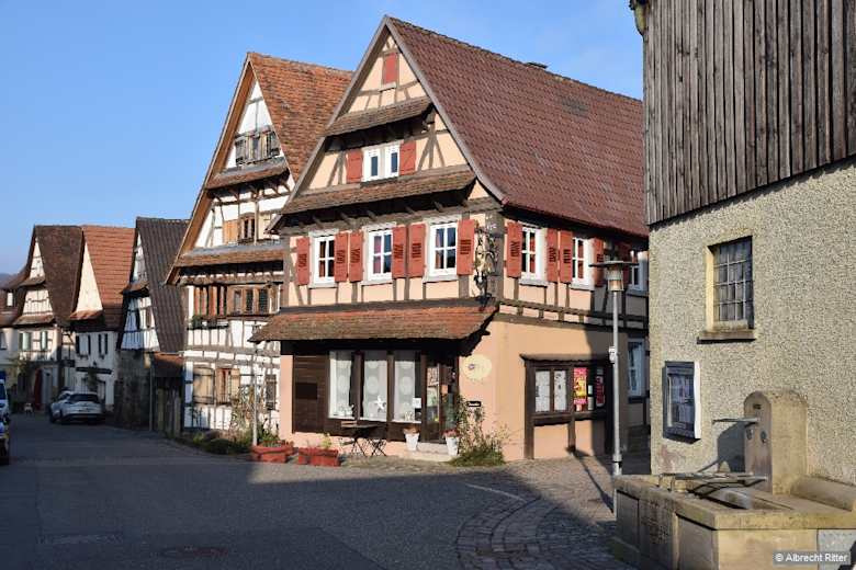 Wir kehren um, wandern hinunter ins Dorf, biegen auf der Meisenstraße nach rechts ab und am ehemaligen Pfarrhaus nach links in Richtung Kirche. Herrliche Fachwerkhäuser zieren den Ortskern von Diefenbach. Nach dem ehemaligen Gasthof Ochsen zweigen wir rechts ab in die Zaisersweiher Straße, passieren die Weingärtnergenossenschaft und überqueren die Straße. Dahinter halten wir uns rechts und verlassen über die Burrainstraße, vorbei an alten Holzscheuern, den Ort (Wanderweg SD1). An der Kreuzung nach dem Wanderparkplatz nehmen wir den halb links, direkt auf die Weinberge des Anbaugebiets Diefenbacher König zuführenden Weg. Mitten durch die Weinberge gelangen wir zu einer Bacchus-Skulptur, wo wir uns nach links orientieren. Nach einer Kurve eröffnet sich am Geologischen Fenster Wilder Fritz mit Picknickmöglichkeit eine prächtige Aussicht. Wir verlassen den geteerten Panoramaweg nach rechts und biegen gegenüber der Holzskulptur links ab. Der schmale, mit SD1 bezeichnete Waldpfad führt uns oberhalb der Weinlage am Aussichtspunkt König (Schutzhütte) vorbei, der uns herrliche Blicke zum Nordschwarzwald beschert.