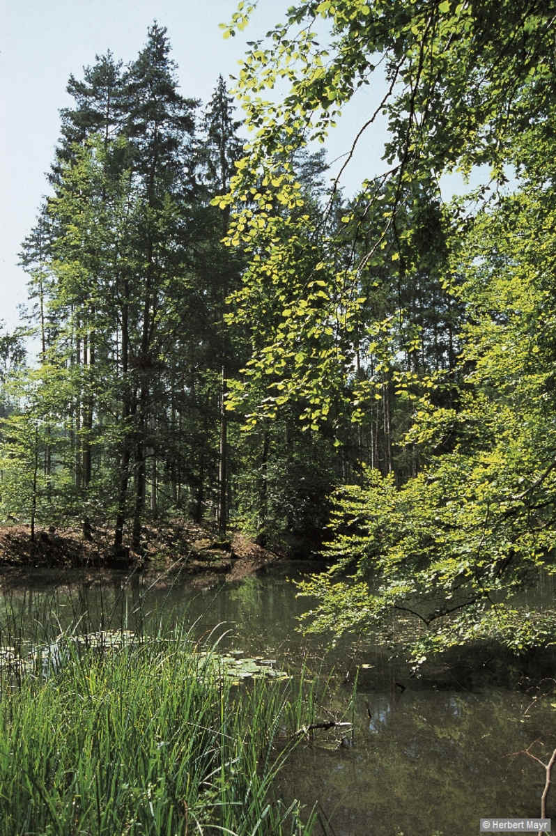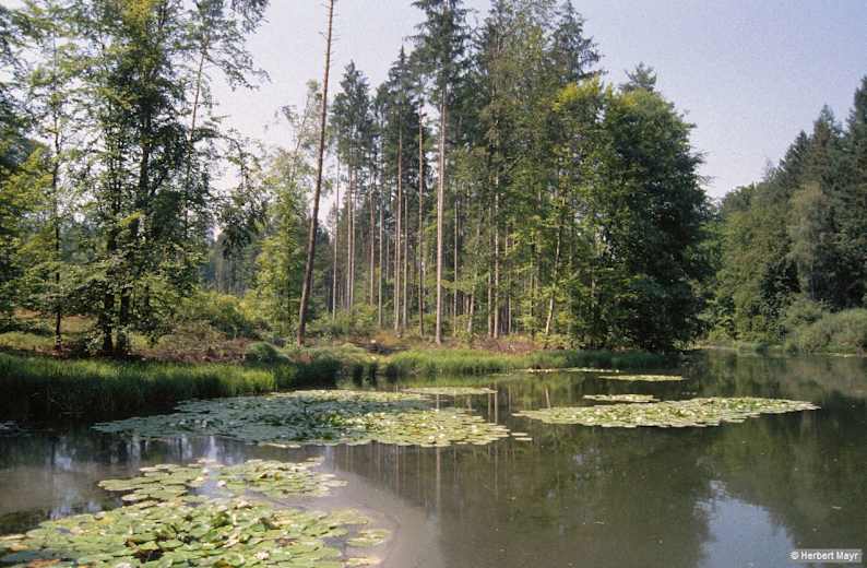 Nachdem wir auf dem geräumigen Vorplatz ein wenig Seestimmung getankt haben, gehen wir zurück zur Verzweigung am Waldrand und folgen dem Forstweg mit baldigem Gefälle zur Nellenfurt, 425 m. Dort könnte man noch dem oberen Nellenfurter Weiher einen Besuch abstatten.