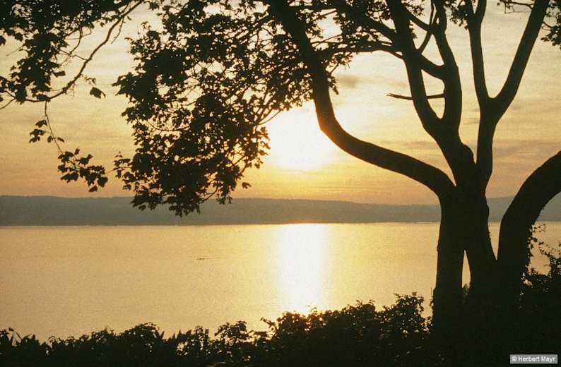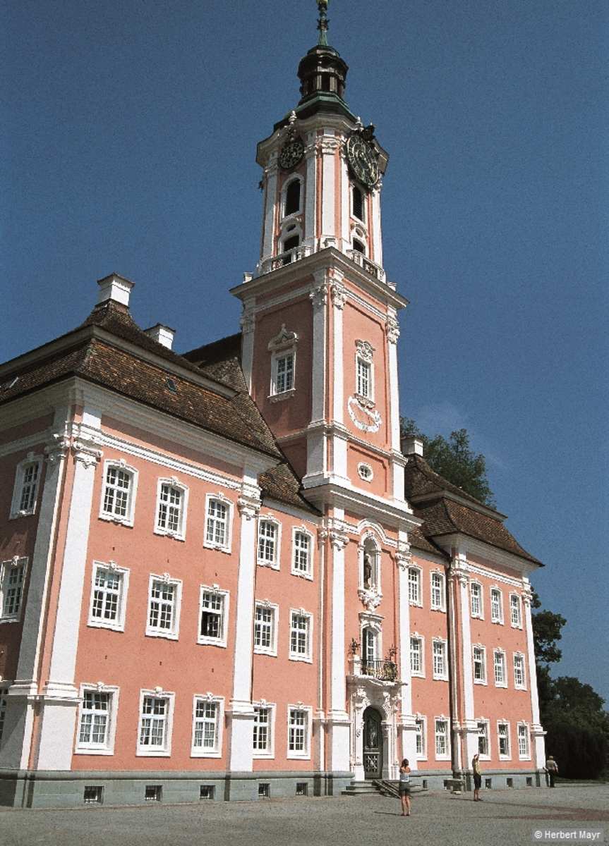 Von der schmuckreichen früheren Klosterkirche Birnau, nach der Säkularisation kurioserweise eine Zeit lang als Scheune genutzt, hat man eine fabelhafte Aussicht über die zum schlanken Überlinger See hin abfallenden Weinberge gegen den langen Bodanrück und in die glänzende Uhldinger Bucht.