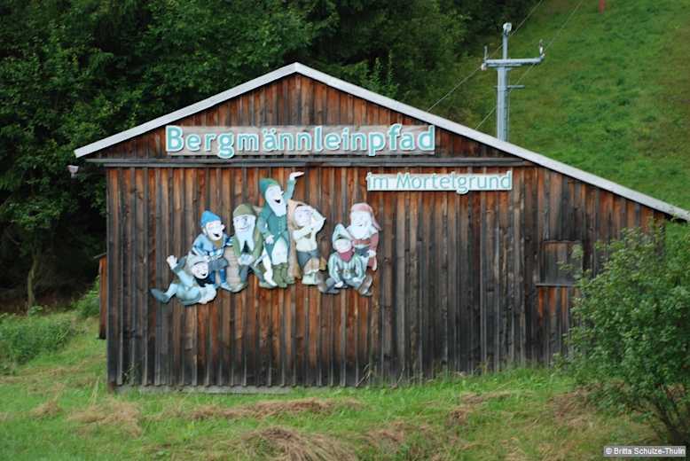 Wir gehen zurück zur Kreuzung und biegen dort rechts in Richtung Mortelgrund ein. An einem Abzweig wandern wir geradeaus weiter. Im Freien wenden wir uns an einem Teich nach rechts. Hier beginnen Bergmännleinpfad und Naturlehrpfad. Fragen zur Natur werden unter Klappen beantwortet. An der Mortelmühle laufen wir geradeaus weiter. An der Straße halten wir uns kurz links und bei den Gebäuden der Jugendherberge rechts. Als Wanderzeichen dient hier wieder der gelbe Balken. An der Gabelung geht es rechts in den oberen Weg, in den Schwarzen Busch. Wir folgen vorläufig dem geteerten Weg. Am Abzweig halten wir uns rechts und bleiben auf dem Hauptweg. An der Gabelung biegen wir rechts ein. Hier beginnt eine kleine Durststrecke, die aber bald überwunden ist. An der Kreuzung laufen wir geradeaus weiter. In einer Rechtskurve gehen wir links und folgen den Wanderzeichen. Jetzt sind wir wieder auf einem schönen Waldweg. An einer Bank geht es ins Freie. Hier lässt sich links der Schwartenberg erspähen. Wir kommen wieder in den Wald. Wo der grüne Balken abzweigt, gehen wir geradeaus und gelangen wieder ins Freie. In der Ferne wird bald der Saydaer Kirchturm sichtbar. An der Straße halten wir uns mit gelbem und rotem Balken scharf links. Wer abkürzen möchte, kann hier rechts schnell nach Sayda gelangen (Einsparung ca. 1,5 km). Wieder ist linker Hand der Schwartenberg zu sehen.