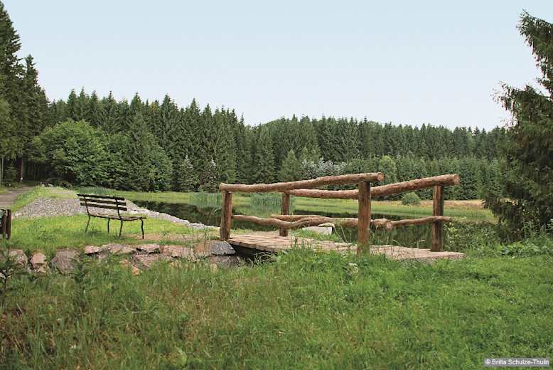 Der Schwemmteich bietet wertvollen Lebensraum, vor allem für seltene Blumen, Gräser und Amphibien. Foto: Britta Schulze-Thulin, Bergverlag Rother GmbH