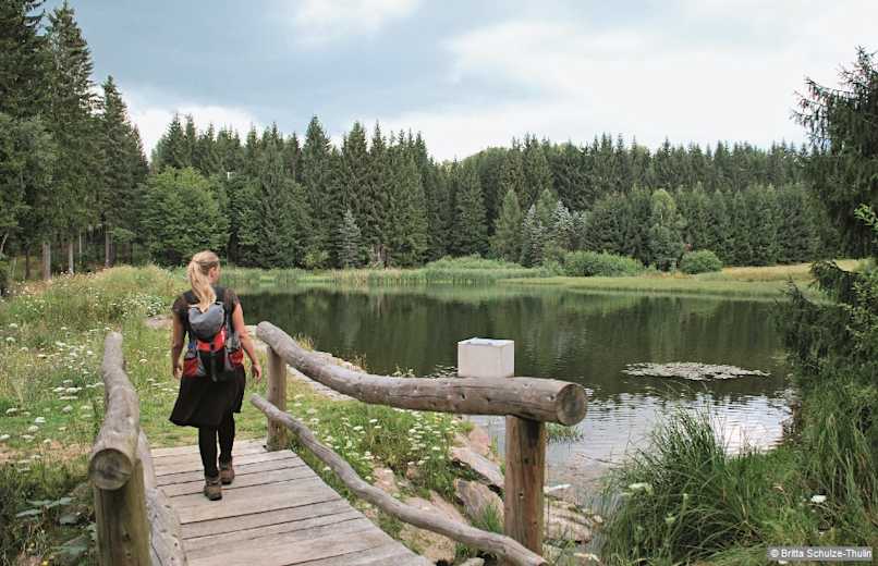 An einer Kreuzung leitet uns der Kammweg nach rechts, an der nächsten führt geradeaus ein Abstecher zum Schwemmteich. Foto: Britta Schulze-Thulin, Bergverlag Rother GmbH